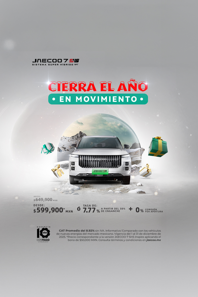 Precios en Moneda Nacional. Chirey Motor México, S. de R.L. de C.V., se reserva el derecho de efectuar en cualquier momento modificaciones en el equipamiento y en los precios sin previo aviso. Las especificaciones aplican para cada uno de los modelos JAECOO y pueden cambiar sin previo aviso.