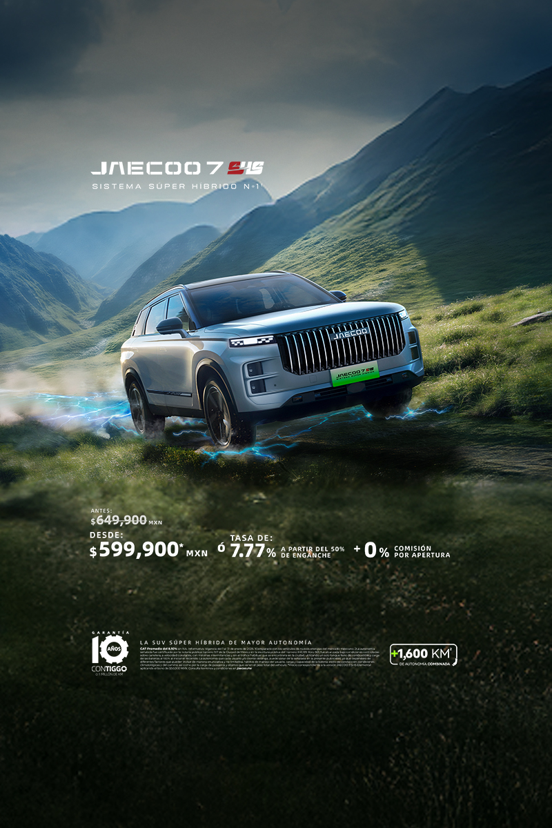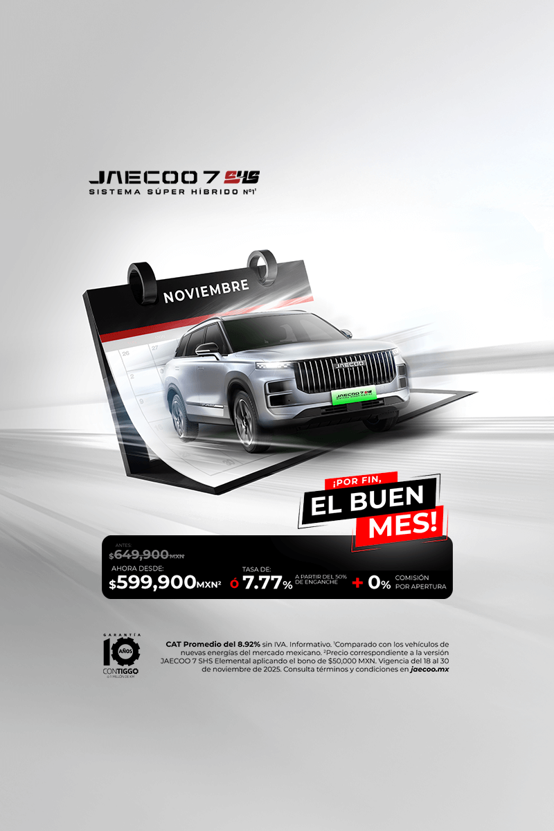 Precios en Moneda Nacional. Chirey Motor México, S. de R.L. de C.V., se reserva el derecho de efectuar en cualquier momento modificaciones en el equipamiento y en los precios sin previo aviso. Las especificaciones aplican para cada uno de los modelos JAECOO y pueden cambiar sin previo aviso.